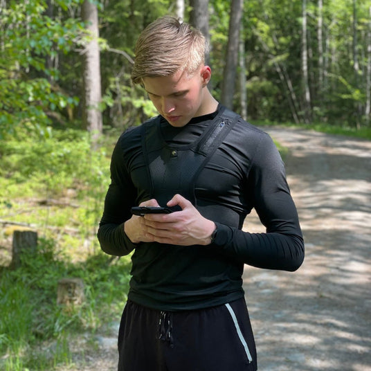 Vesten er utstyr med alt du trenger - glidelåslomme perfekt for oppbevaring av nøkler eller AirPods, refleks, mobilholder og størrelsen kan enkelt justeres.